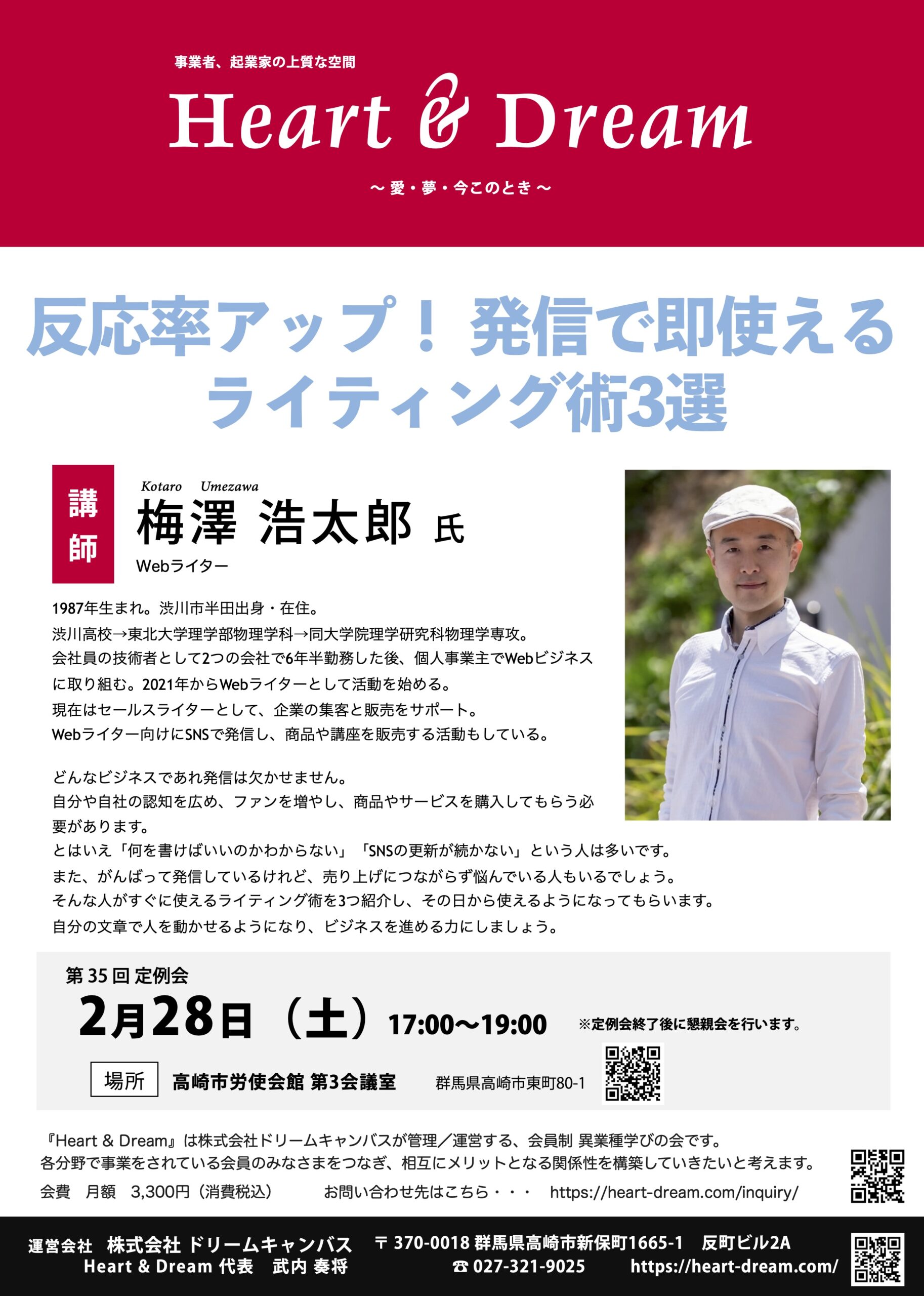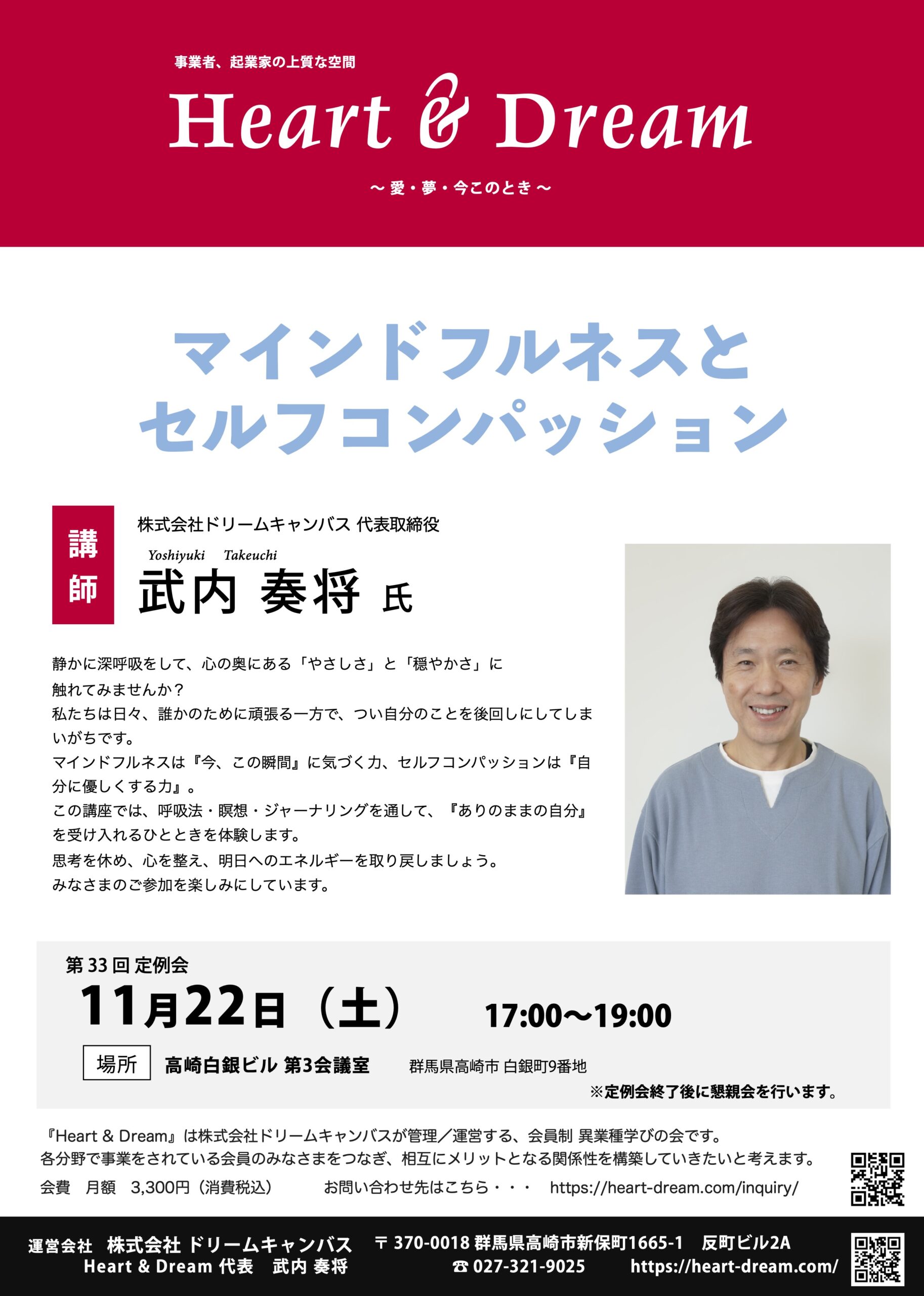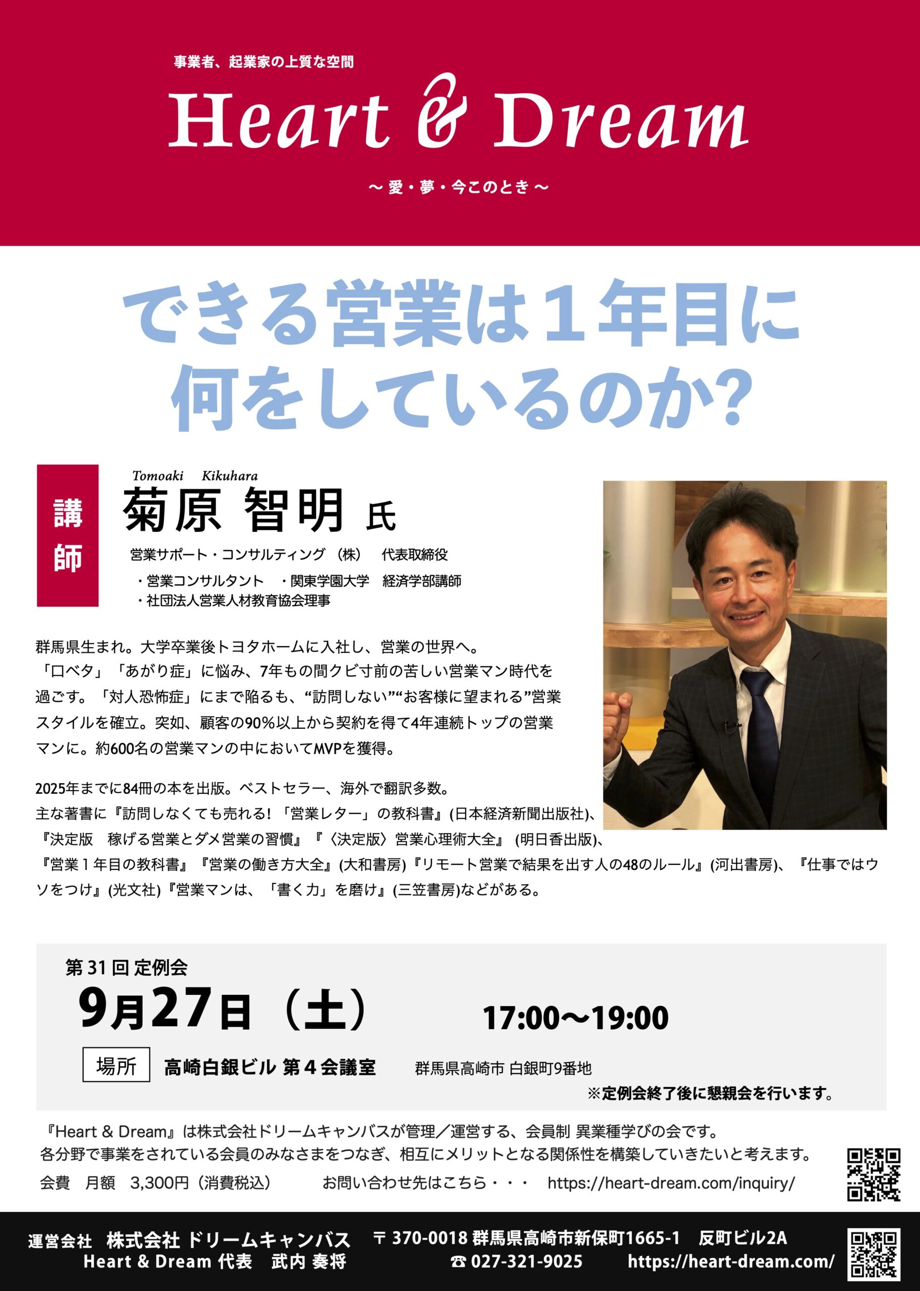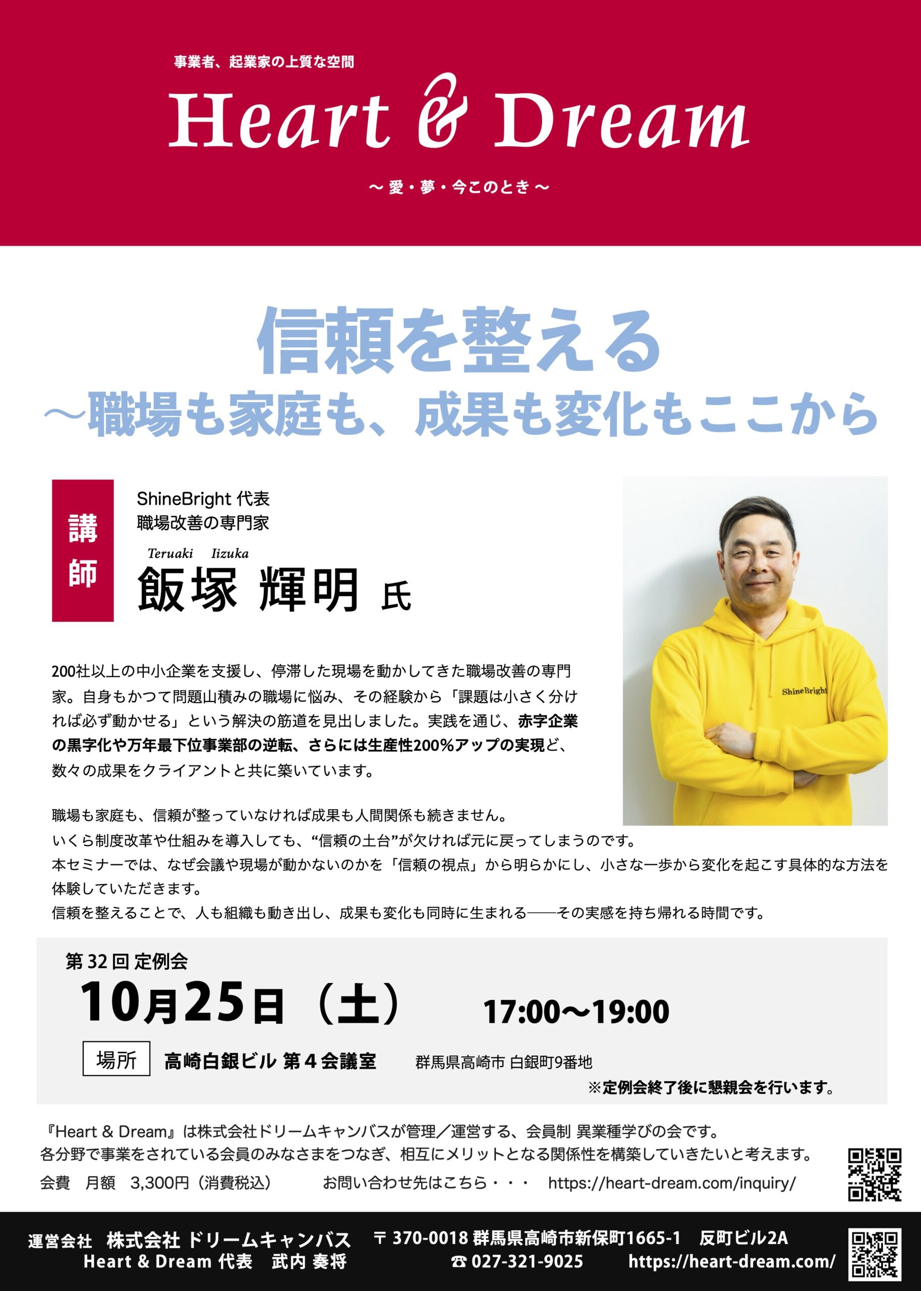 - 群馬県で事業を行う事業者、群馬県にて起業準備中の方、または『Heart & Dream』で真剣に学びたいと思う方であること。
